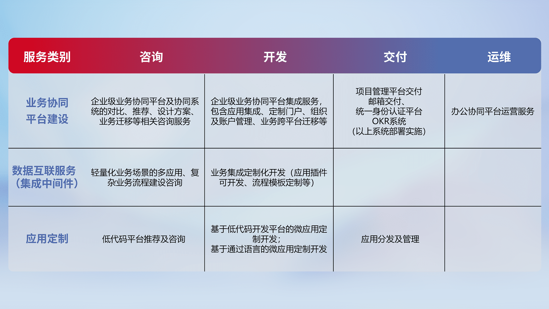 针对钉钉、、企微、、IDaas等平台级产品提供产品的规划、、、、方案、、、、交付、、定制化开发等服务,,,实现如统一协同办公、、、智能客户服务、、、混合会议管理、、、智能数据查询、、、等业务场景,,实现数字化转型。。